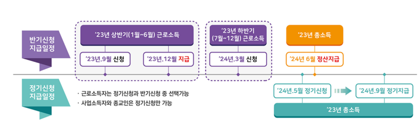 근로 장려금은 정기 신청과 반기 신청이 있습니다. 정기 신청은 1년 근로소득에 대한 장려금 환급이고, 반기 신청은 상/하반기 소득에 대한 장려금 환급이라고 이해하시면 됩니다. 반기 장려금은 소득 발생시점과 장려금 수급 시간 차이가 큰 단점을 보완하고 실질적 체감도를 높히기 위해 2019년부터 시행되었습니다.